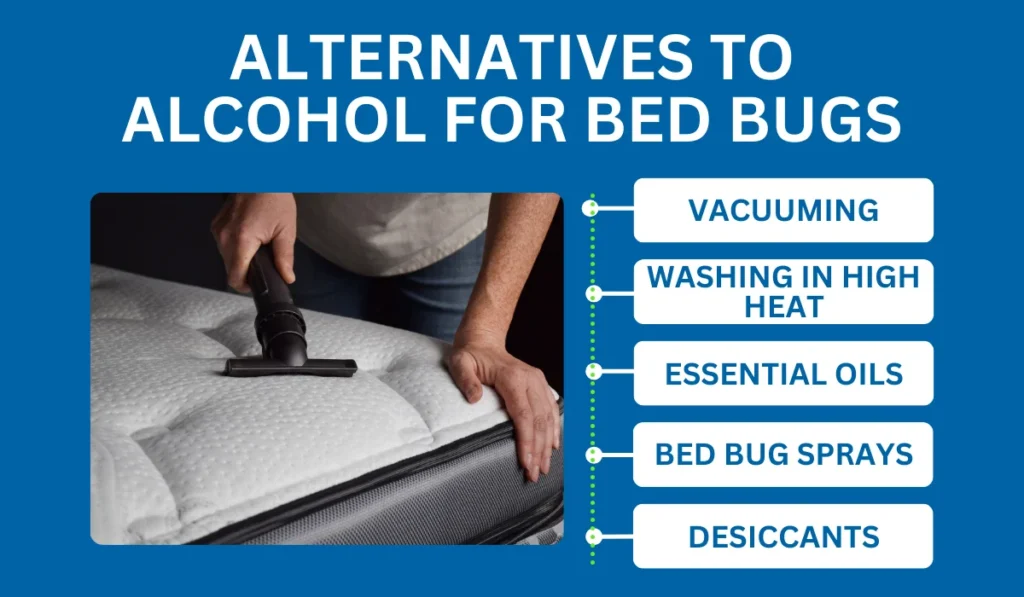 - Alcohol kills bed bugs by drying them out but only works on contact and isn’t fully effective.