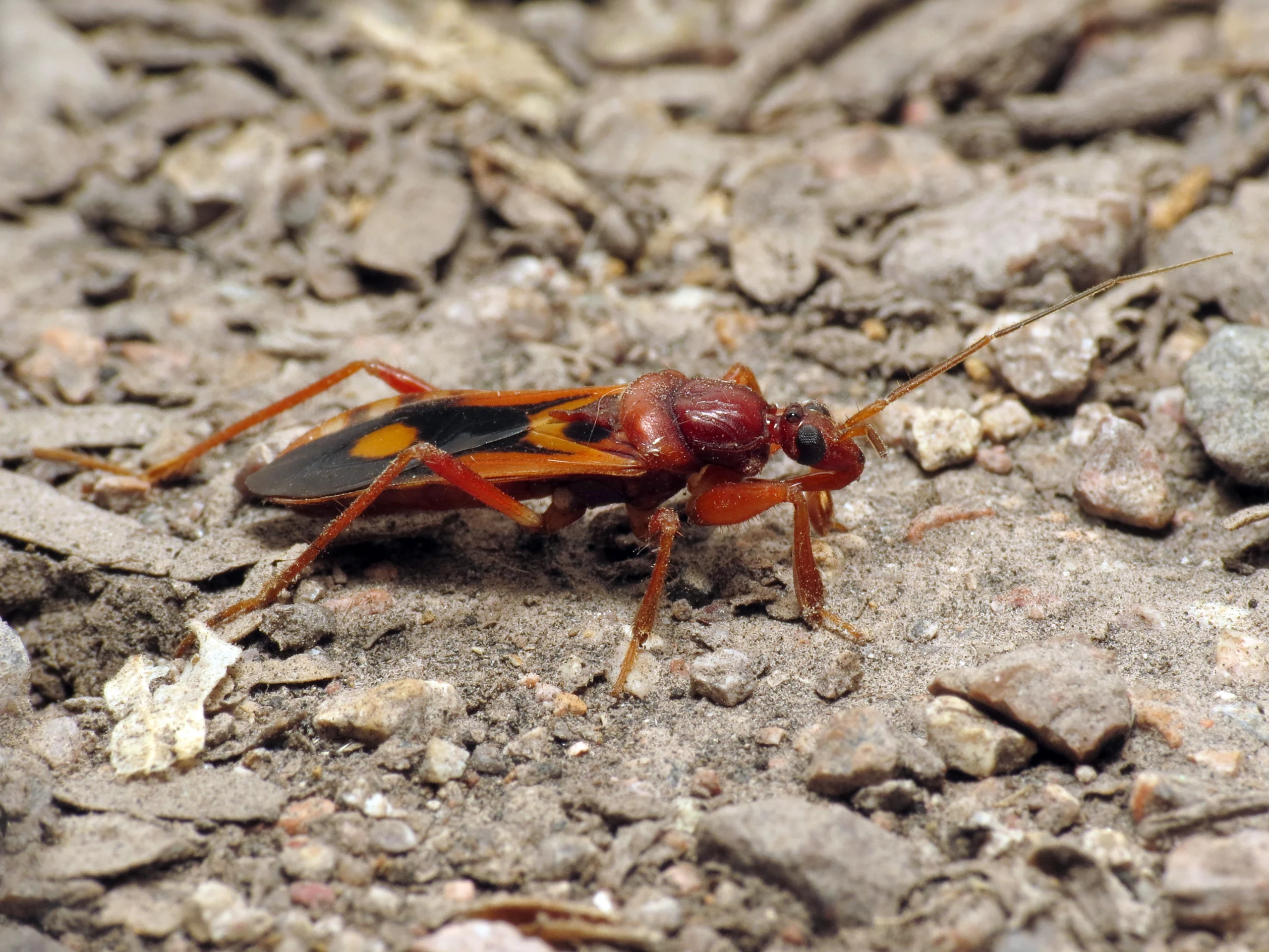 The Western Corsair is a unique little critter belonging to a species known as assassin bugs. It is readily recognizable by its bright orange markings contrasted with black and dark red body parts.