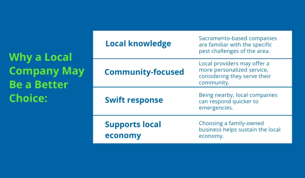 - Local knowledge: Sacramento-based companies are familiar with the specific pest challenges of the area.